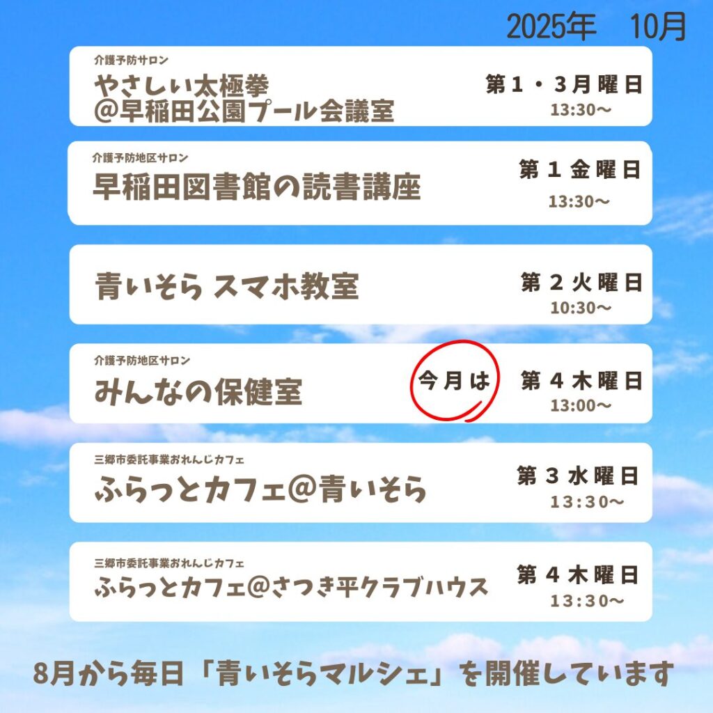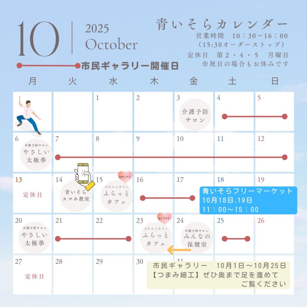 Home お知らせ 10月開催 事業のご案内 10月開催 事業のご案内 2025.10.5 お知らせ Post Share Hatena Pocket RSS feedly Pin it PostShareHatenaPocketRSSfeedly ※10月6日 カレンダーに修正が入りました※9月はカレンダーの更新をお休みいたしまして申し訳ありませんでした。青いそら 10月開催の事業についてお知らせいたします。当月のギャラリーでは【つまみ細工】を展示しています。是非、お店の奥の方まで足を運んでみてください。今月からはやさしい太極拳が月曜日、早稲田プール会議室での開催となっておりますのでご注意ください。※『みんなの保健室』の開催が23日に変更となりました当月から13:00~となります。ふらっとカフェはどなたでもご参加いただける会です。参加費が200円かかります。お気軽にご参加ください。12月までの期間は定休日が祝日であってもお休みとなりますのでお気をつけください。また、現在はレストラン事業は休止となっております。各地から取り寄せたこだわりの品を揃えた『青いそらマルシェ』を開いています。珍しい品、安心して召し上がっていただける品が並んでおります。また、お惣菜のテイクアウトも実施しておりますので是非お持ち帰り容器をお持ちになってお越しいただけたら思います。(もちろんテイクアウト容器の準備もございます。)変更や追加がありましたら、ホームページ内で改めてご案内してまいります。ぜひ定期的にご覧いただけますと幸いです。青いそらでは、皆様の心と身体の健康に繋がる様々な事業を開催しております。カレンダーにお目通しいただき、気になる事業がありましたら、まずは一度お問い合わせください。スタッフ一同皆様のご参加をお待ちしております。電話:048-957-9600 Post Share Hatena Pocket RSS feedly Pin it コメント コメント ( 0 ) トラックバック ( 0 ) この記事へのコメントはありません。 この記事へのトラックバックはありません。 返信をキャンセルする。 名前( 必須 ) E-MAIL( 必須 ) - 公開されません - URL 上に表示された文字を入力してください。Δ